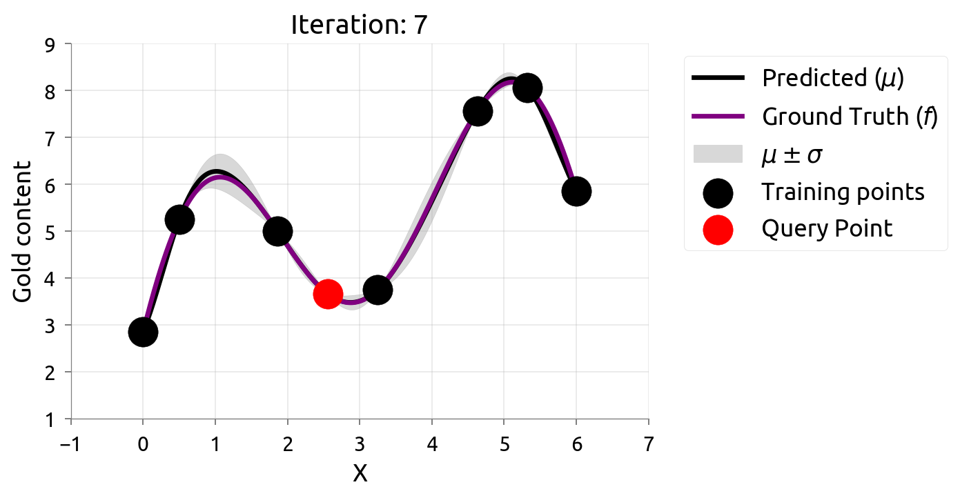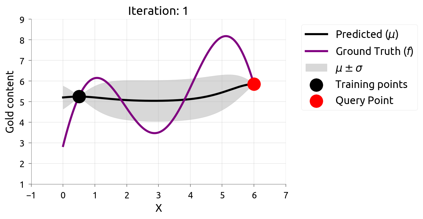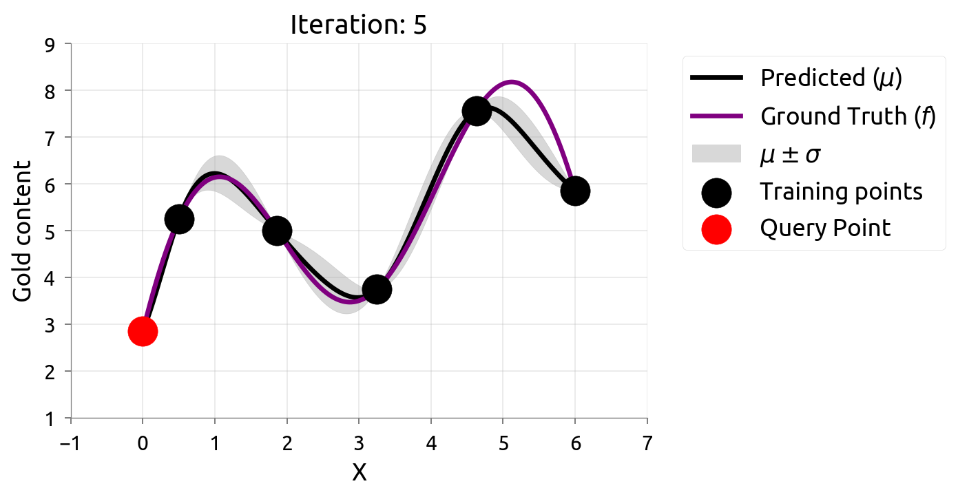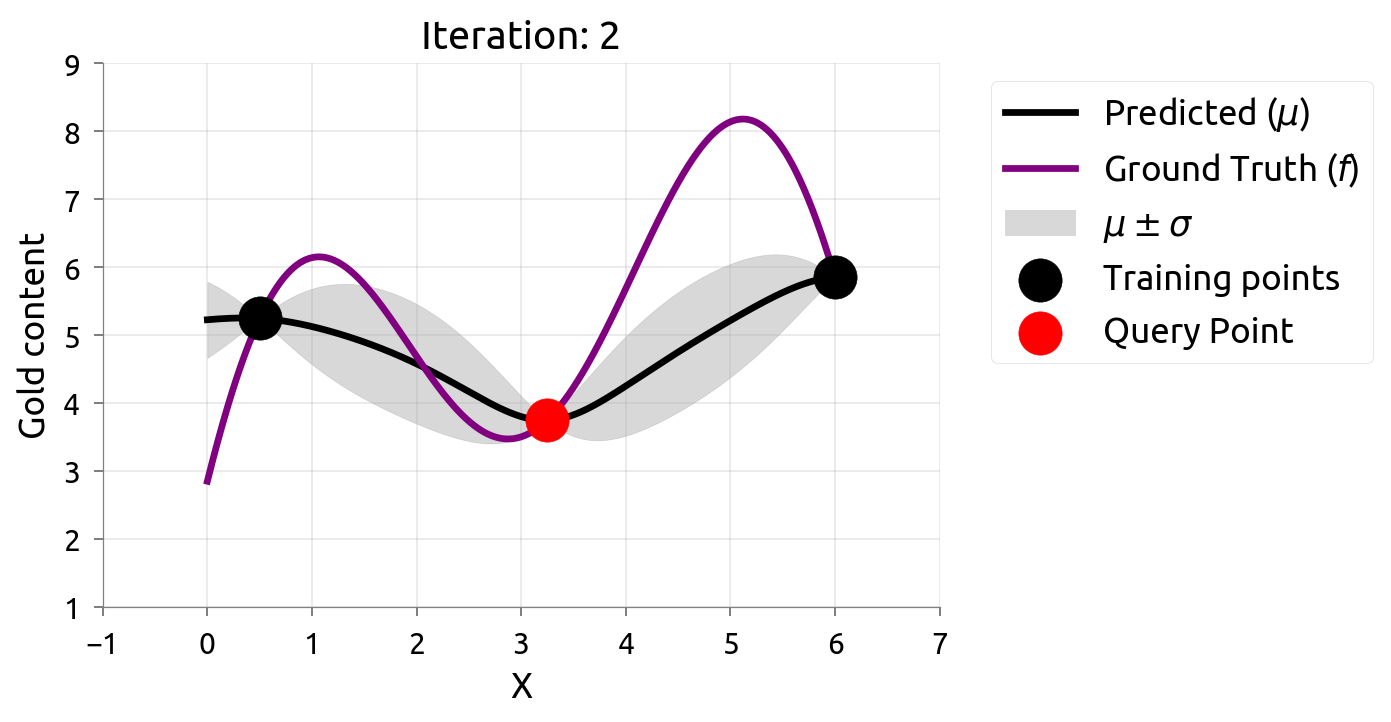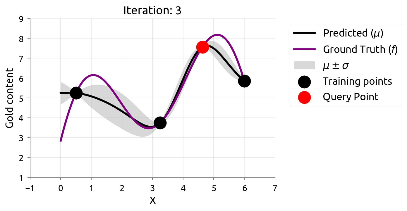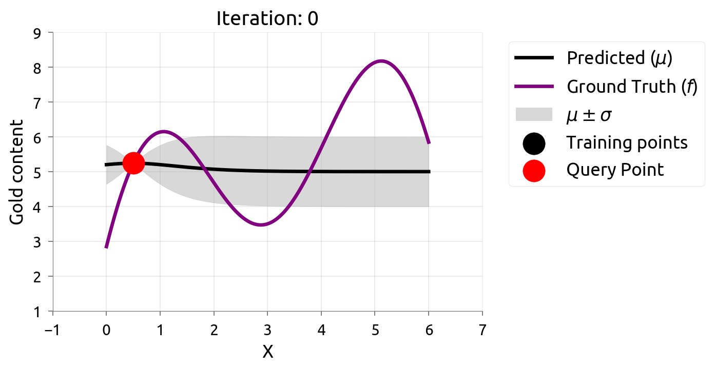 Initially, we have no idea about the gold distribution. We can learn the gold distribution by drilling at different locations. However, this drilling is costly. Thus, we want to minimize the number of drillings required while still finding the location of maximum gold quickly.