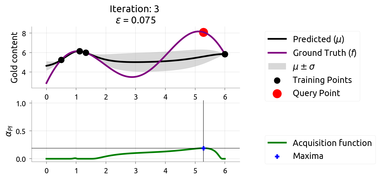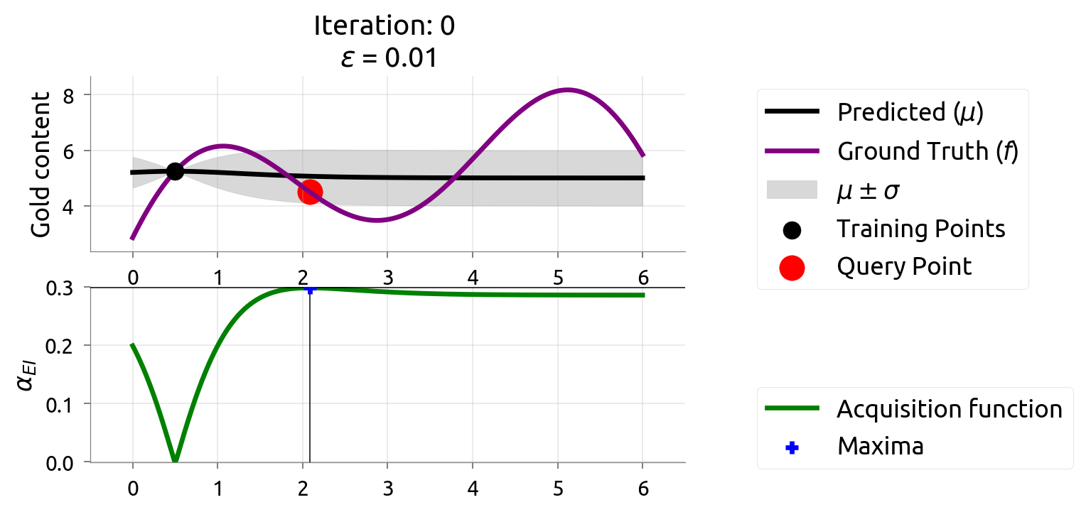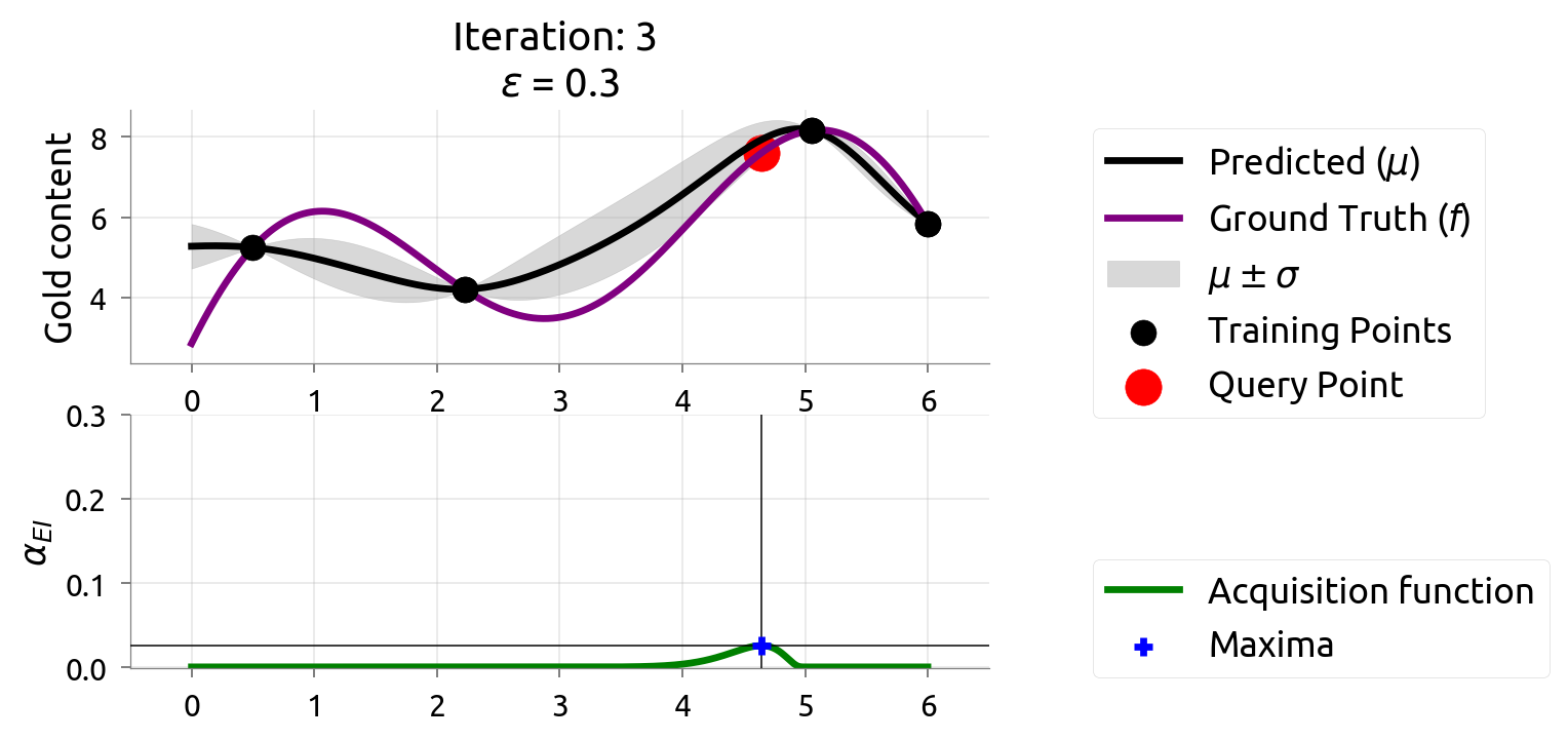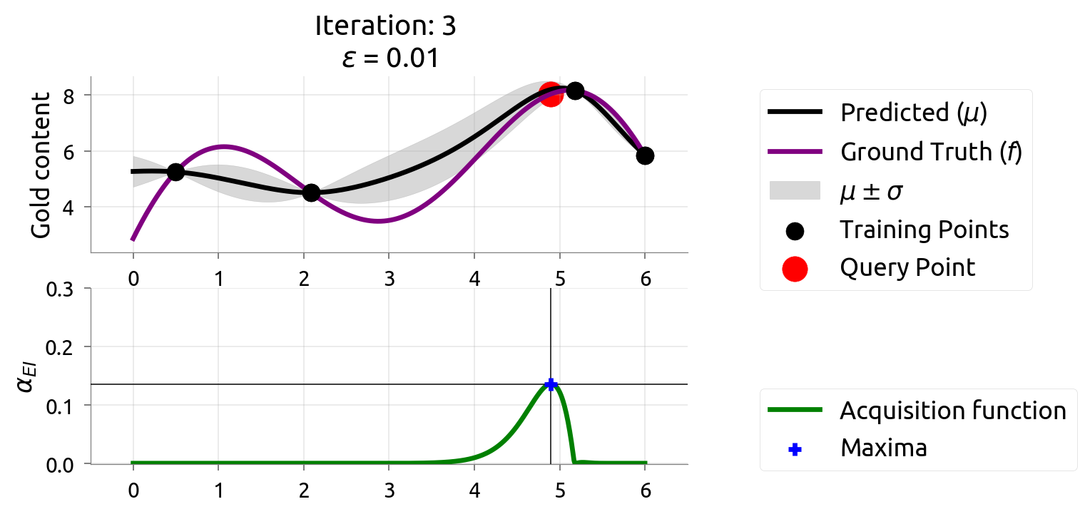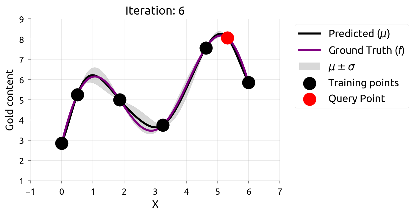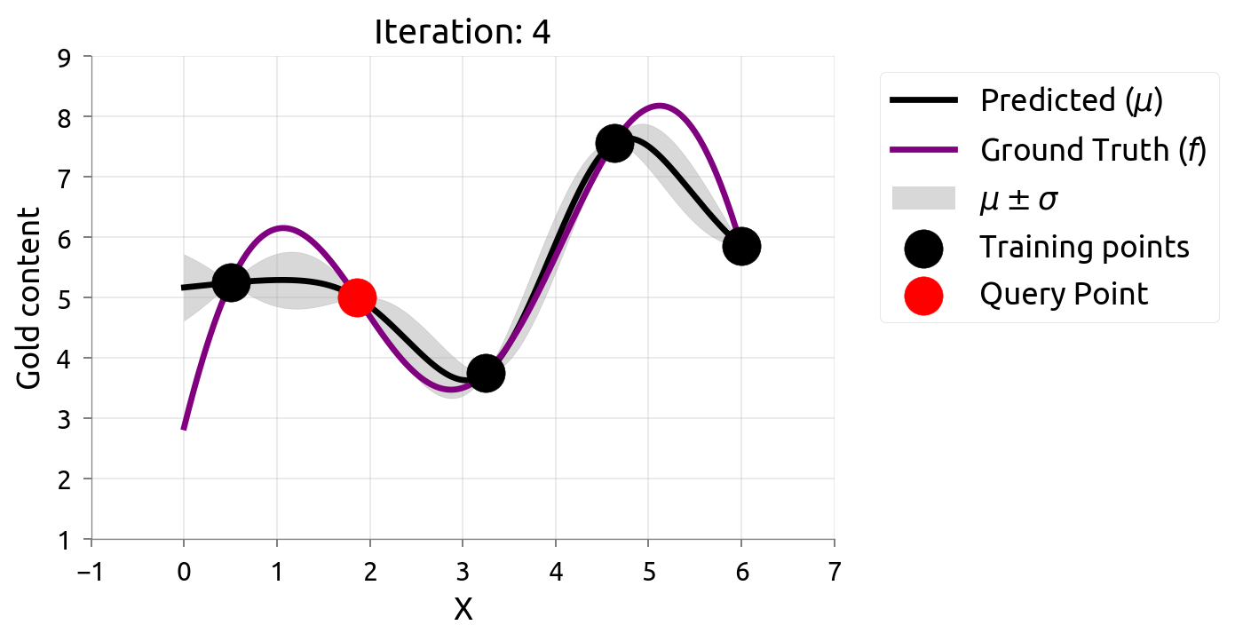 Initially, we have no idea about the gold distribution. We can learn the gold distribution by drilling at different locations. However, this drilling is costly. Thus, we want to minimize the number of drillings required while still finding the location of maximum gold quickly.