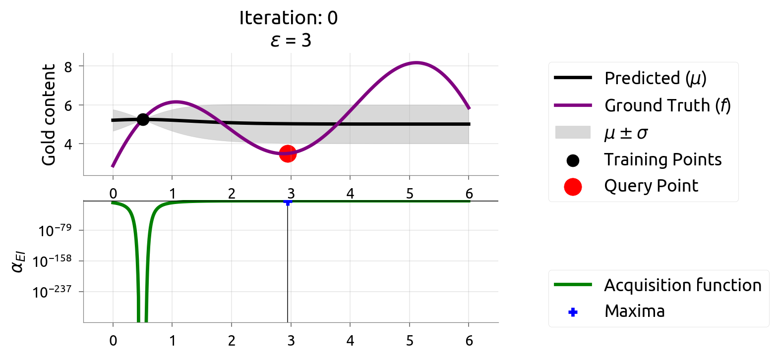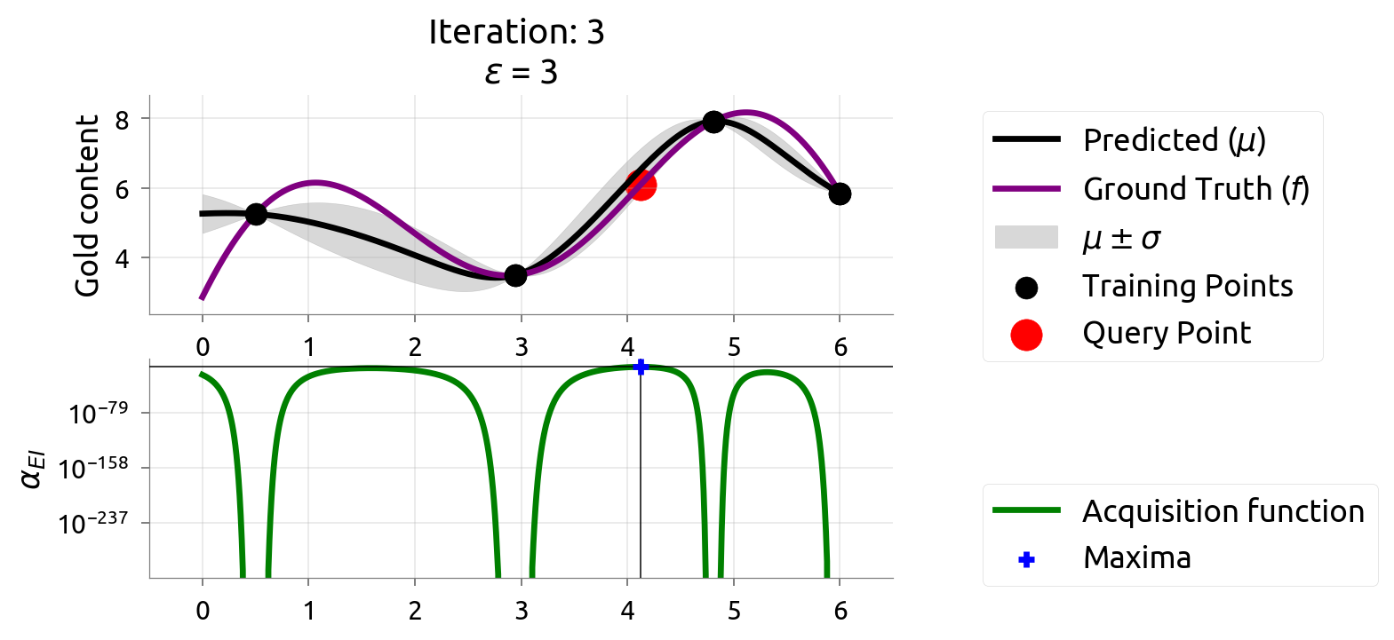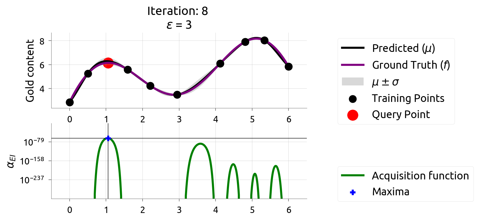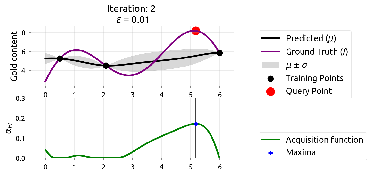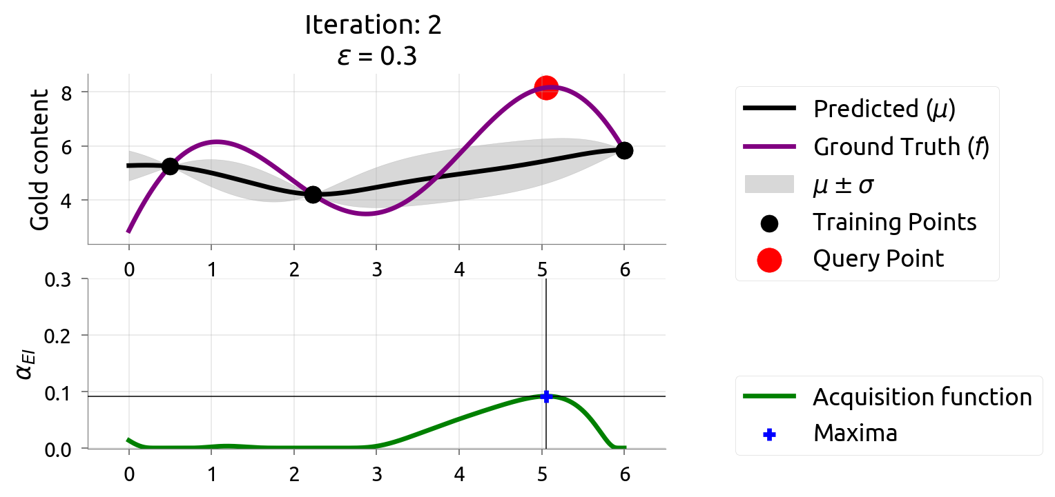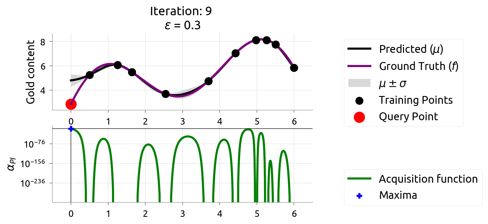 Initially, we have no idea about the gold distribution. We can learn the gold distribution by drilling at different locations. However, this drilling is costly. Thus, we want to minimize the number of drillings required while still finding the location of maximum gold quickly.