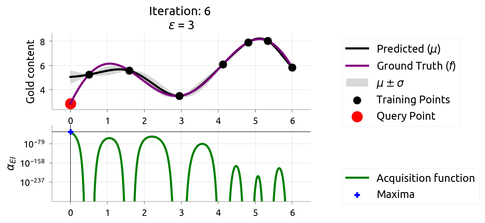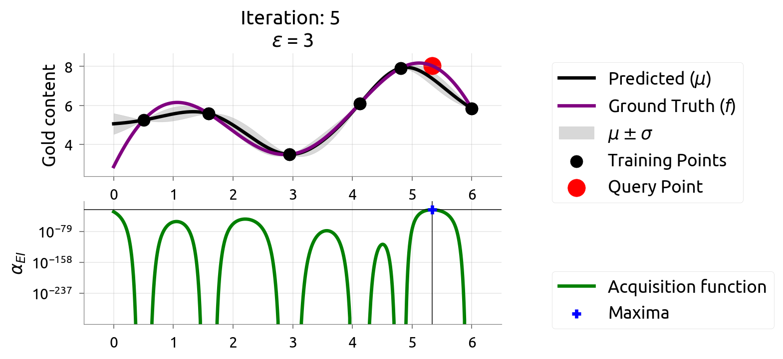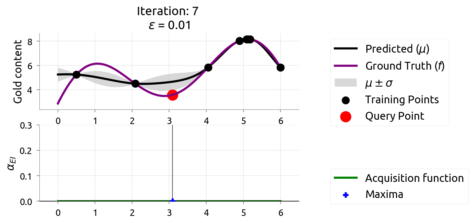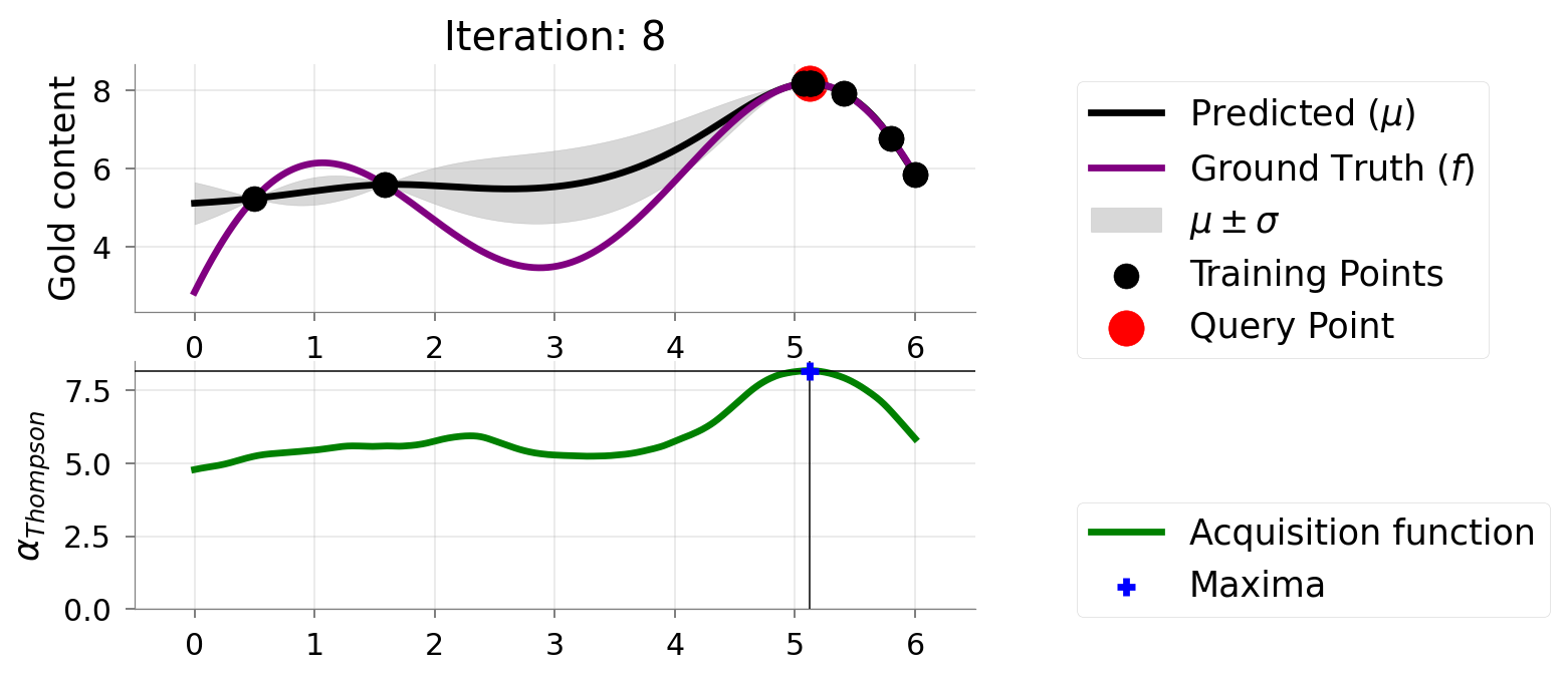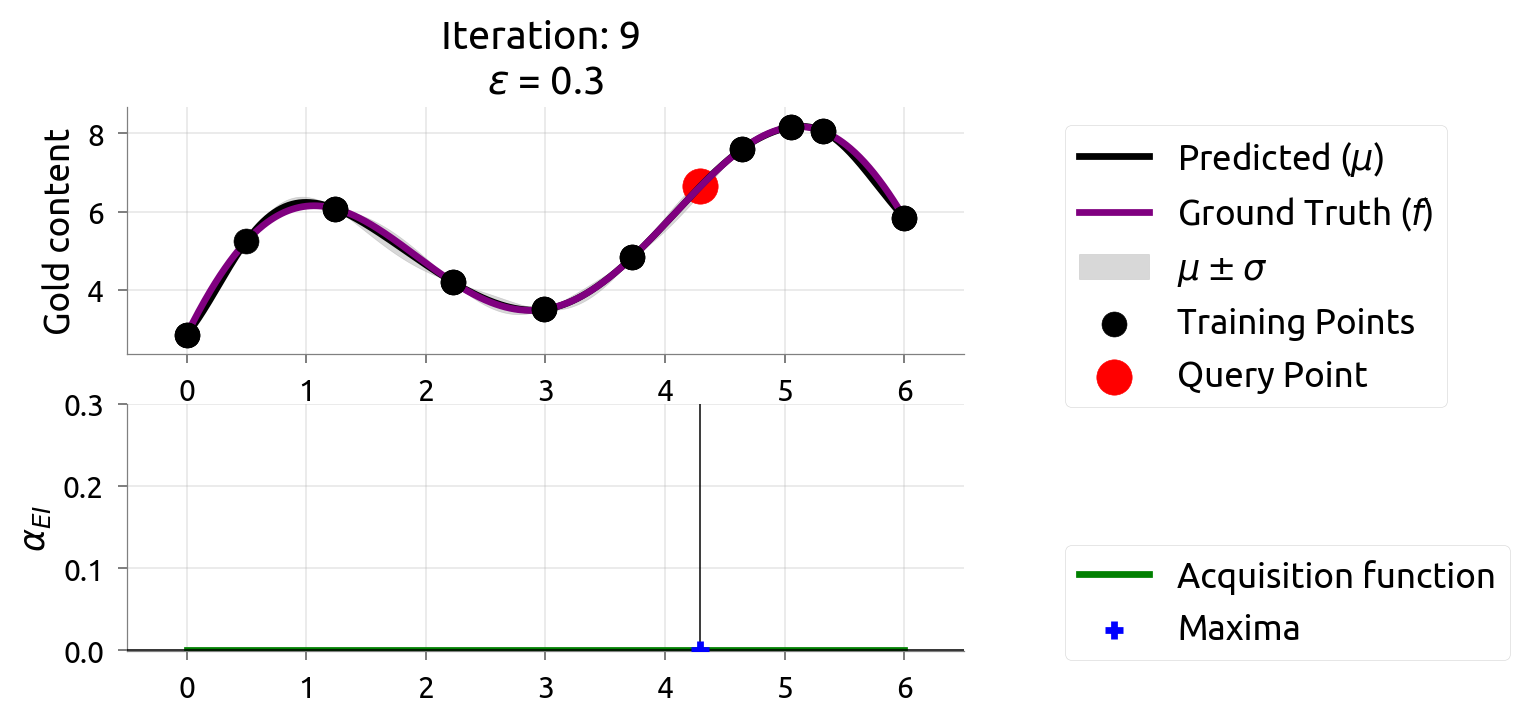 Initially, we have no idea about the gold distribution. We can learn the gold distribution by drilling at different locations. However, this drilling is costly. Thus, we want to minimize the number of drillings required while still finding the location of maximum gold quickly.