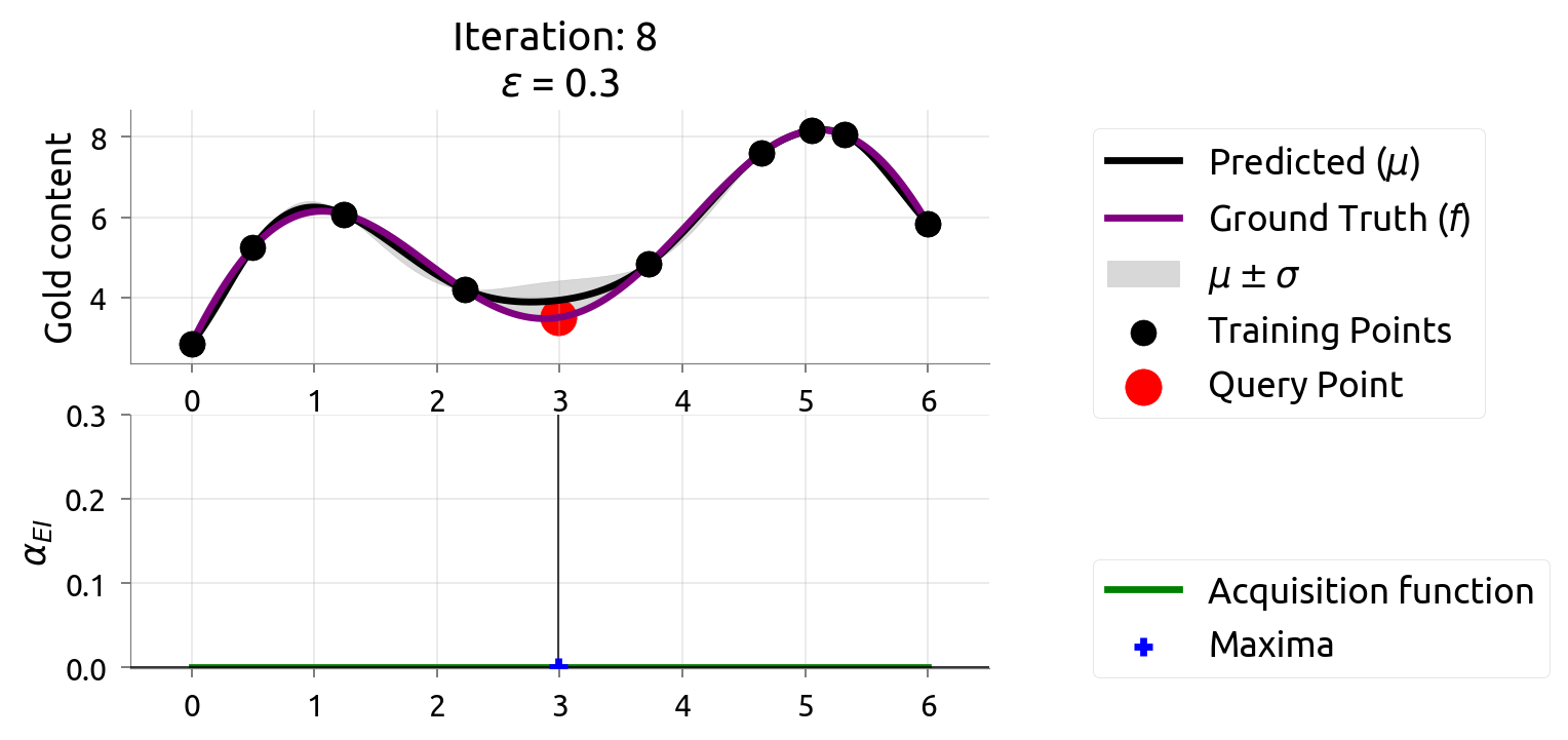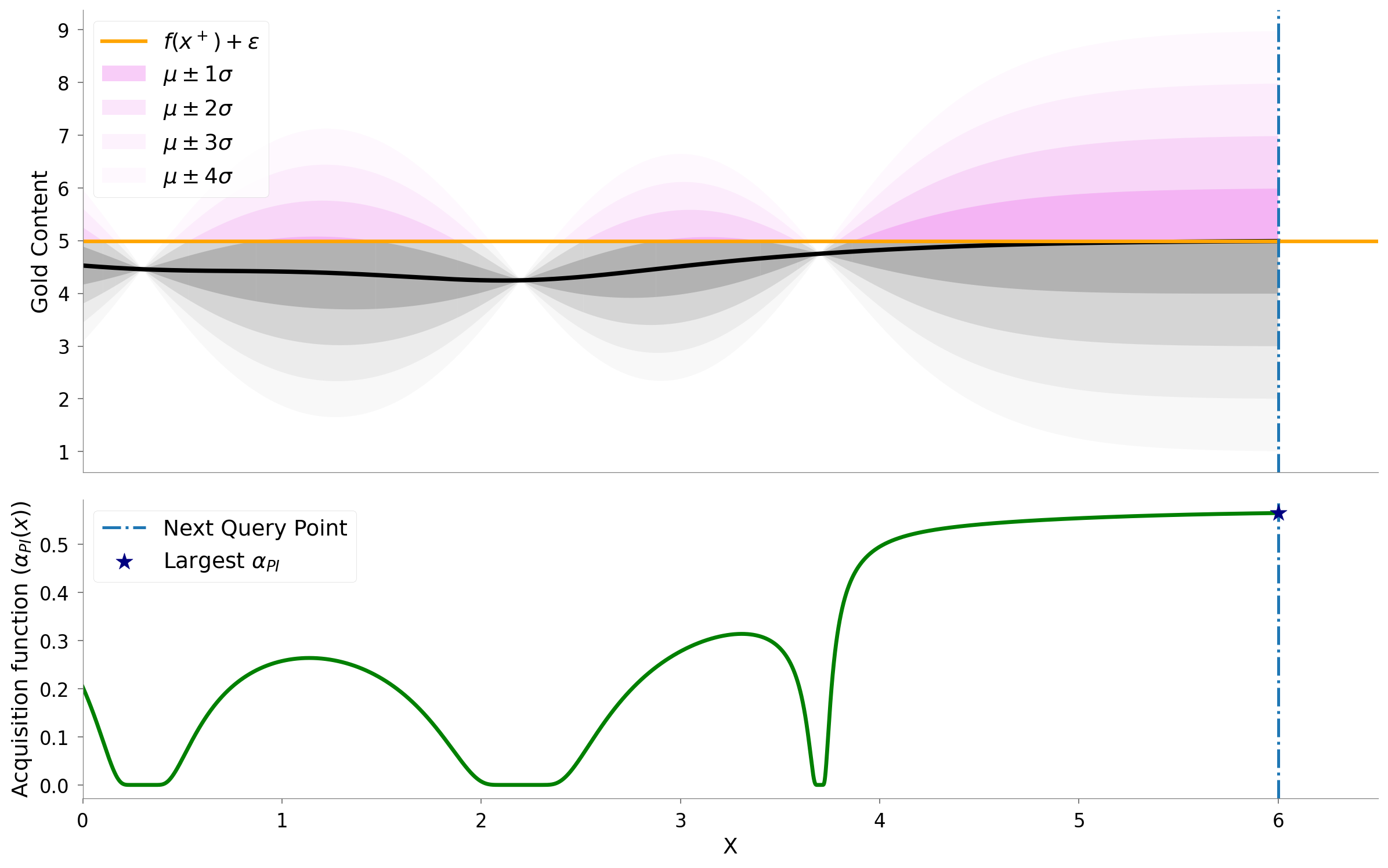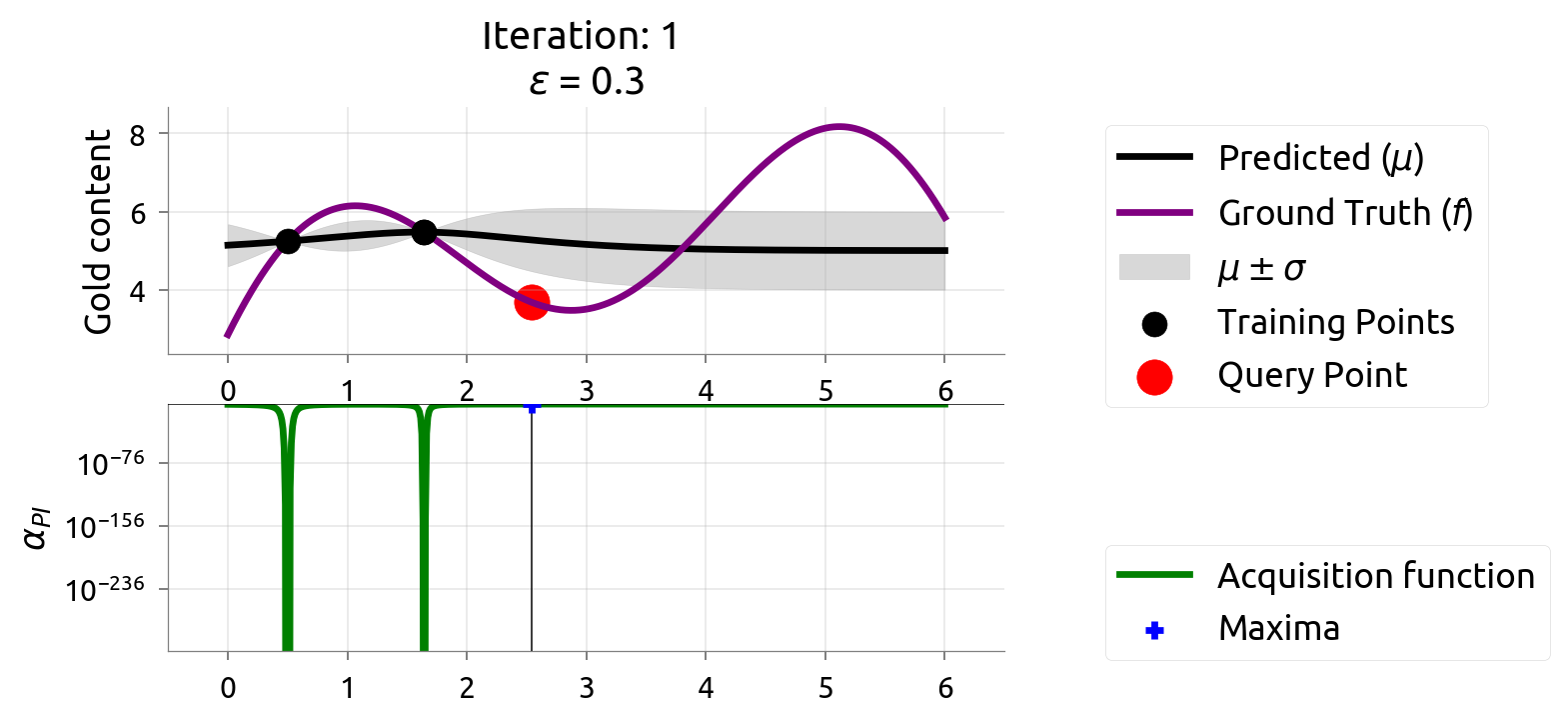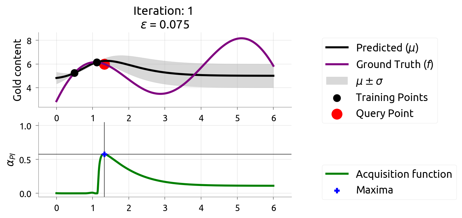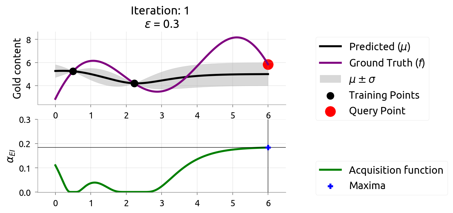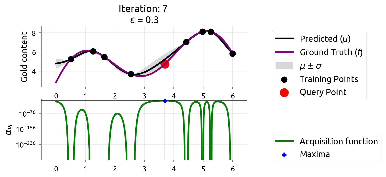 Initially, we have no idea about the gold distribution. We can learn the gold distribution by drilling at different locations. However, this drilling is costly. Thus, we want to minimize the number of drillings required while still finding the location of maximum gold quickly.