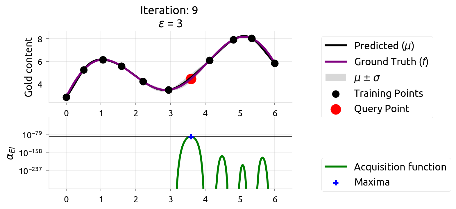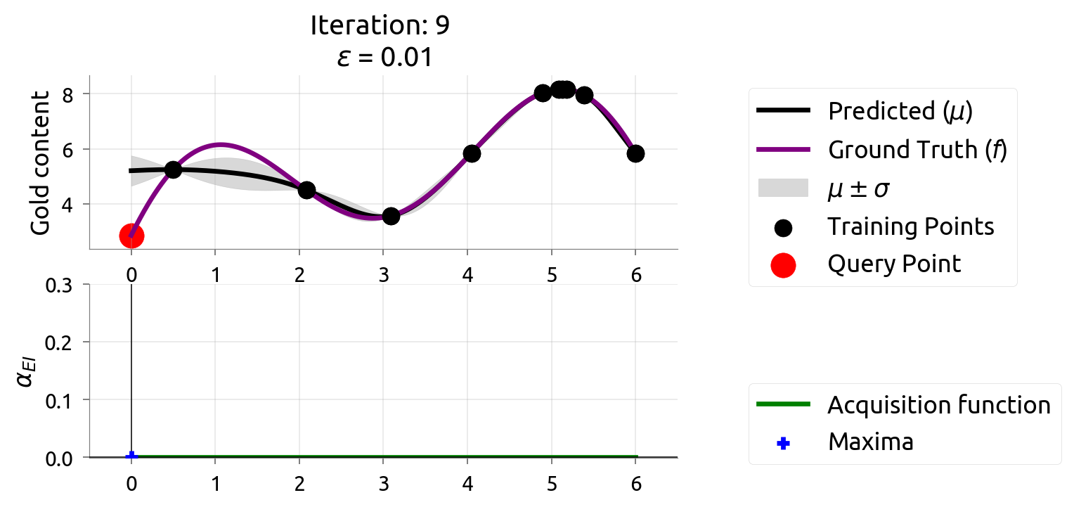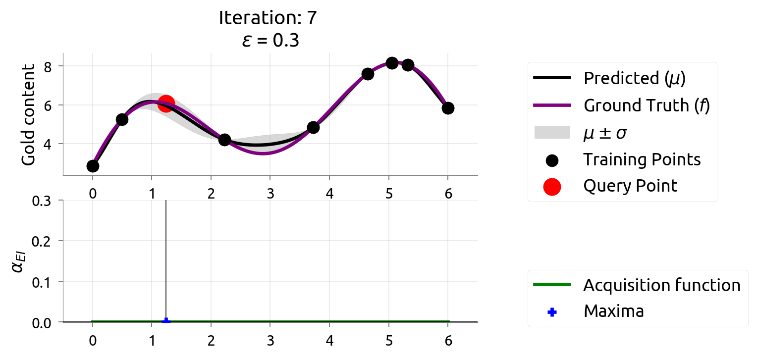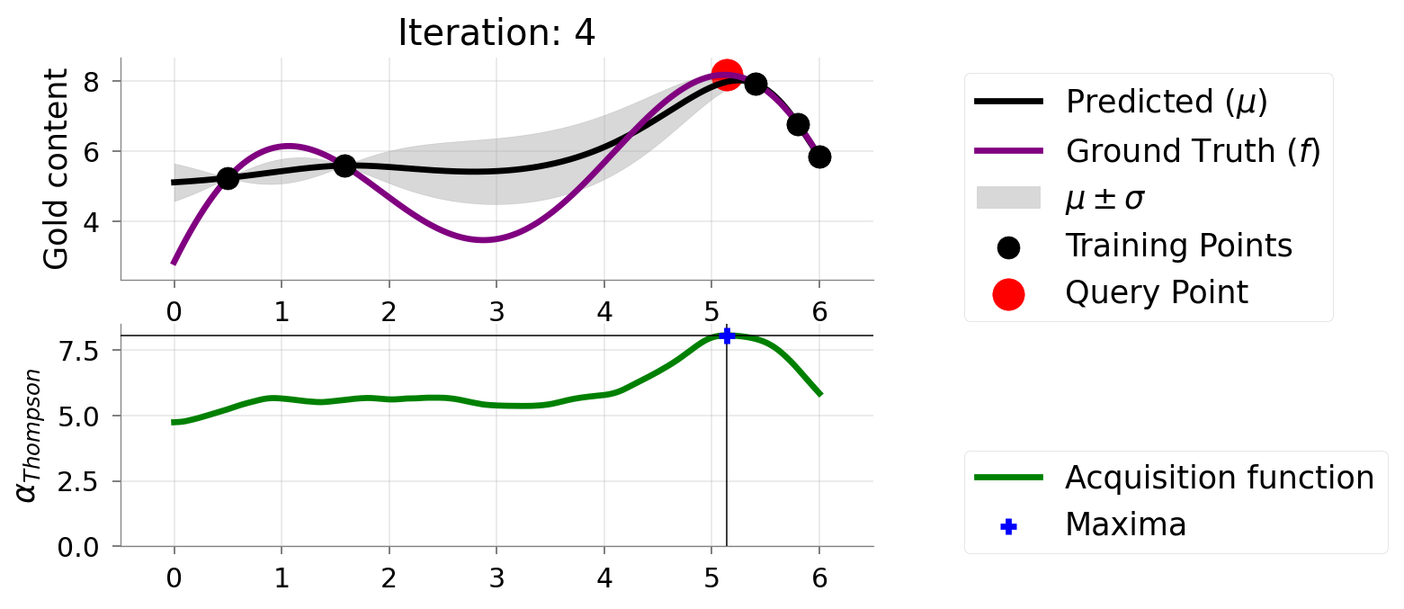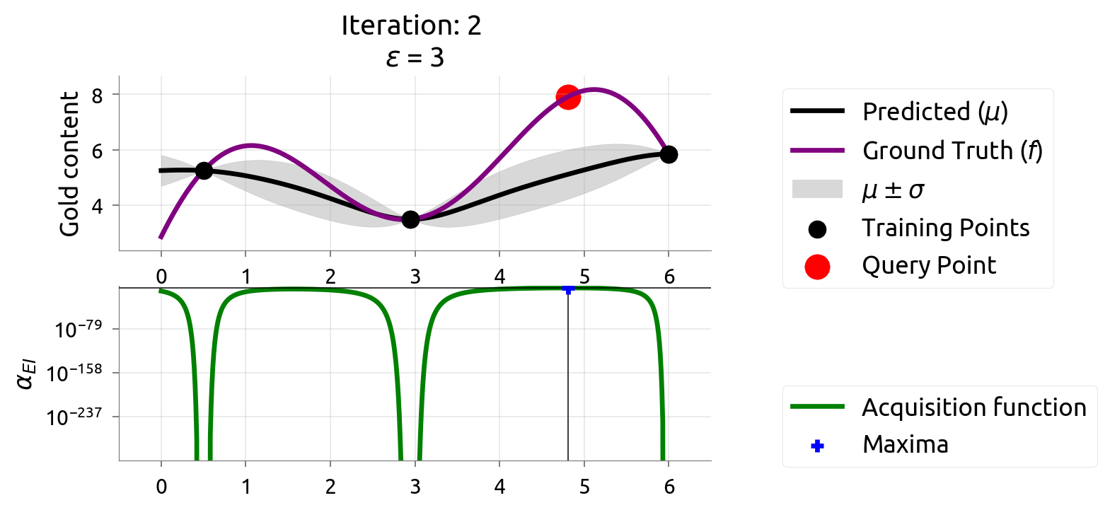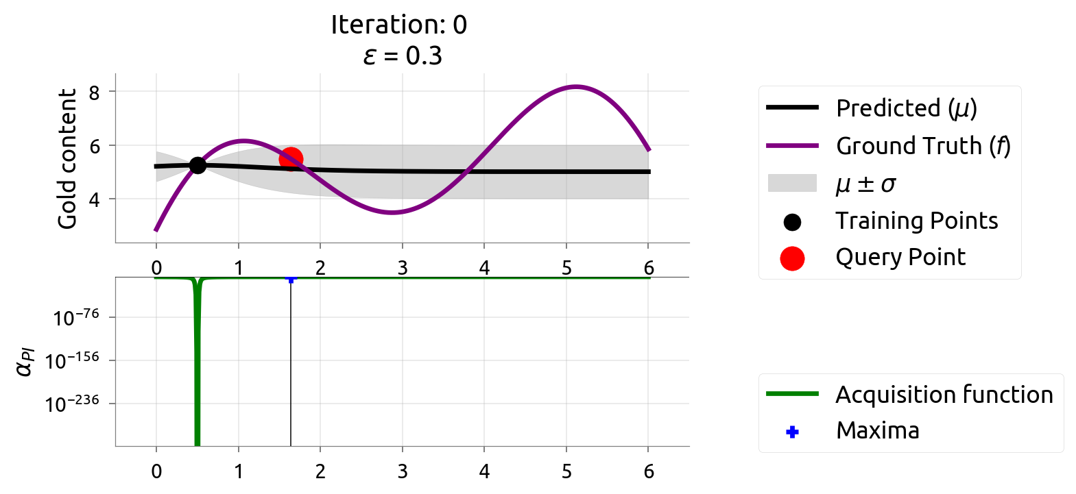 Initially, we have no idea about the gold distribution. We can learn the gold distribution by drilling at different locations. However, this drilling is costly. Thus, we want to minimize the number of drillings required while still finding the location of maximum gold quickly.