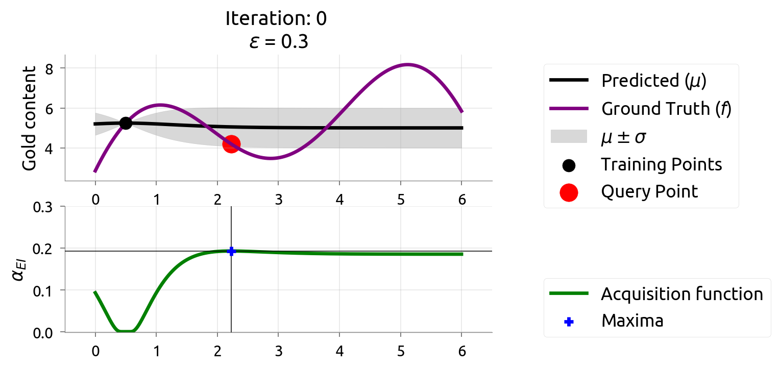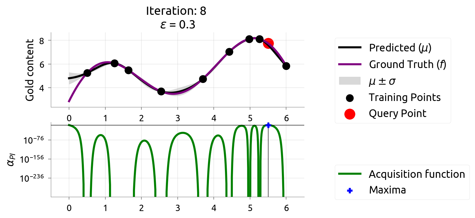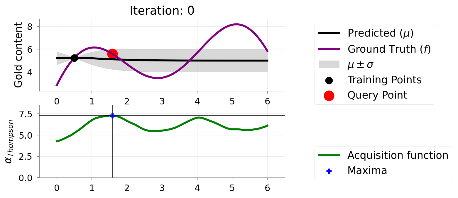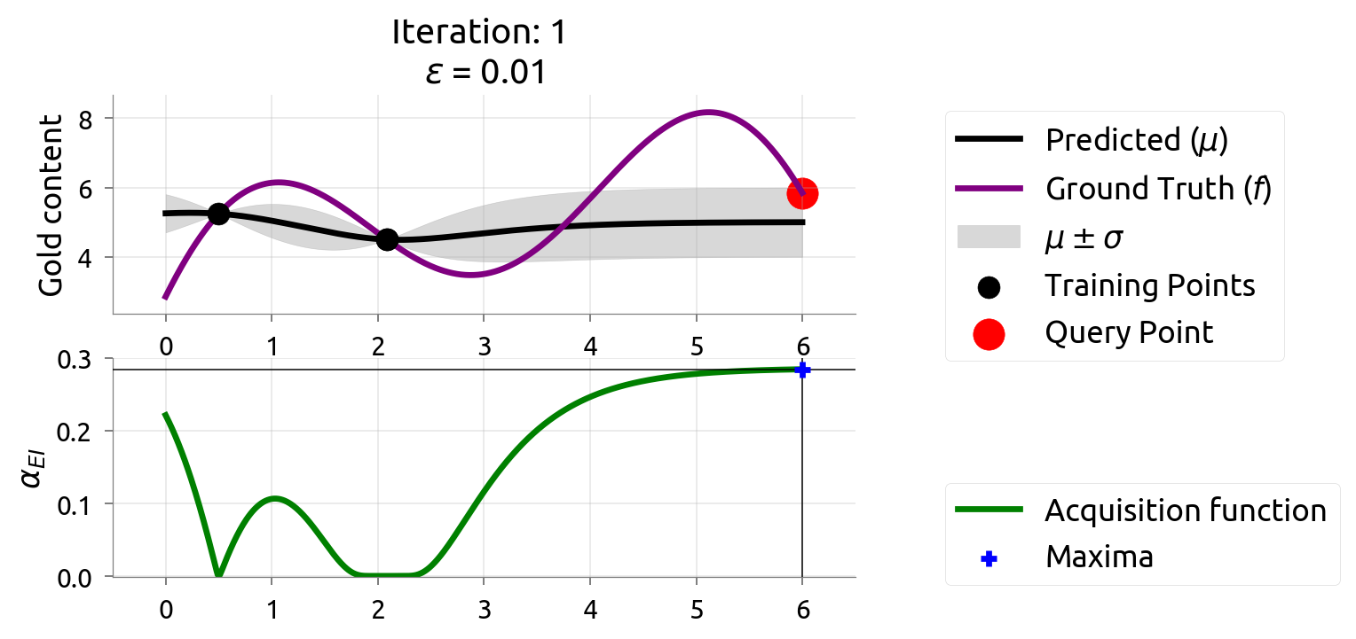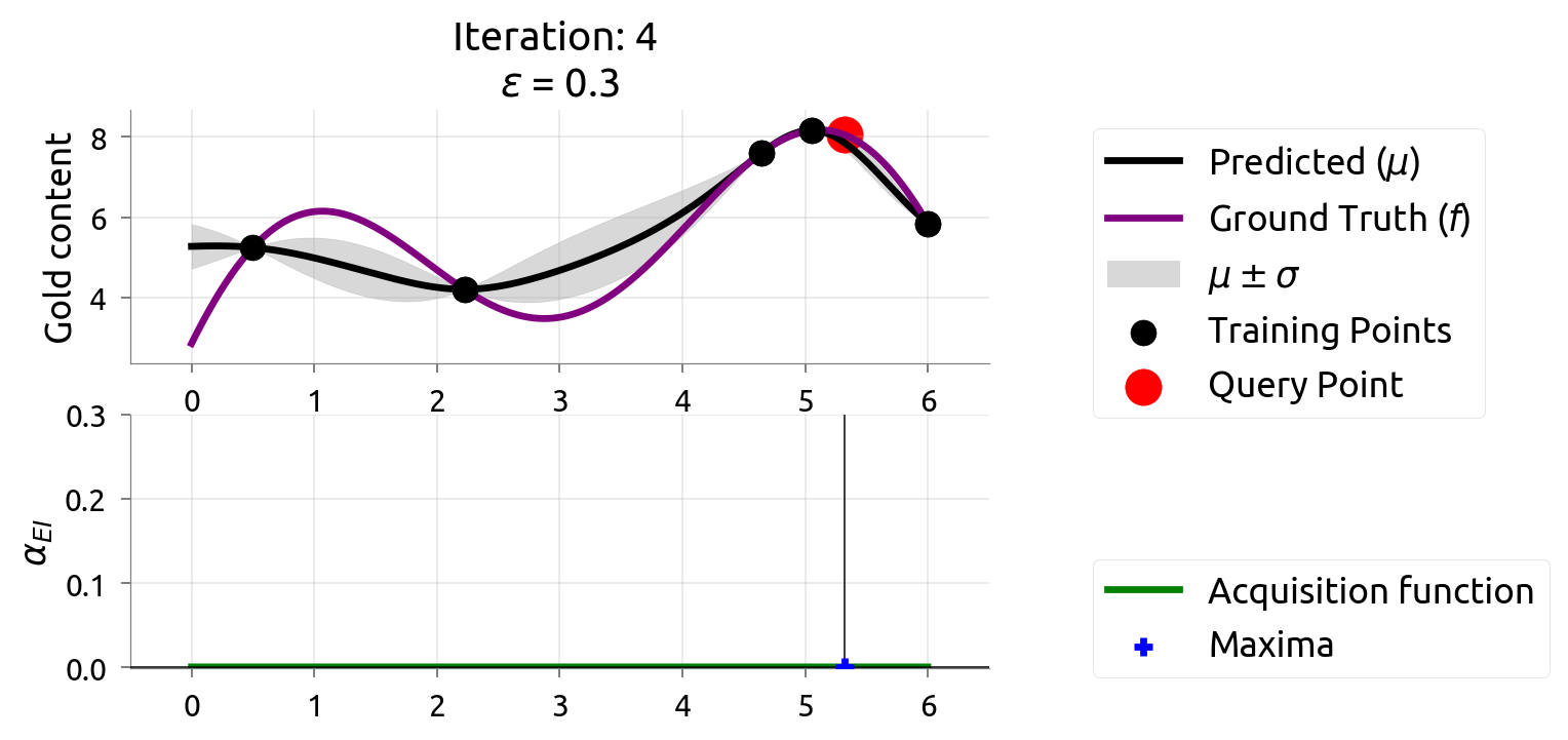 Initially, we have no idea about the gold distribution. We can learn the gold distribution by drilling at different locations. However, this drilling is costly. Thus, we want to minimize the number of drillings required while still finding the location of maximum gold quickly.