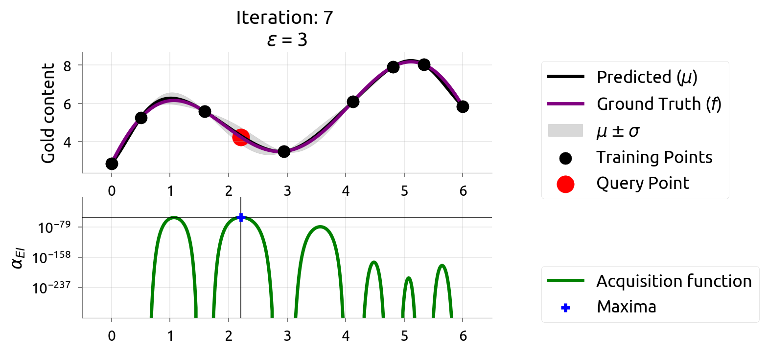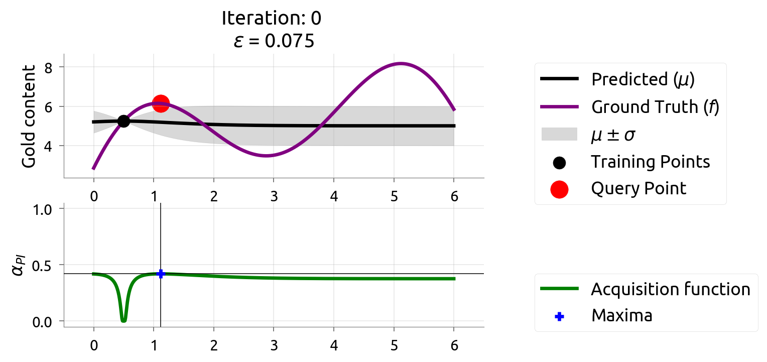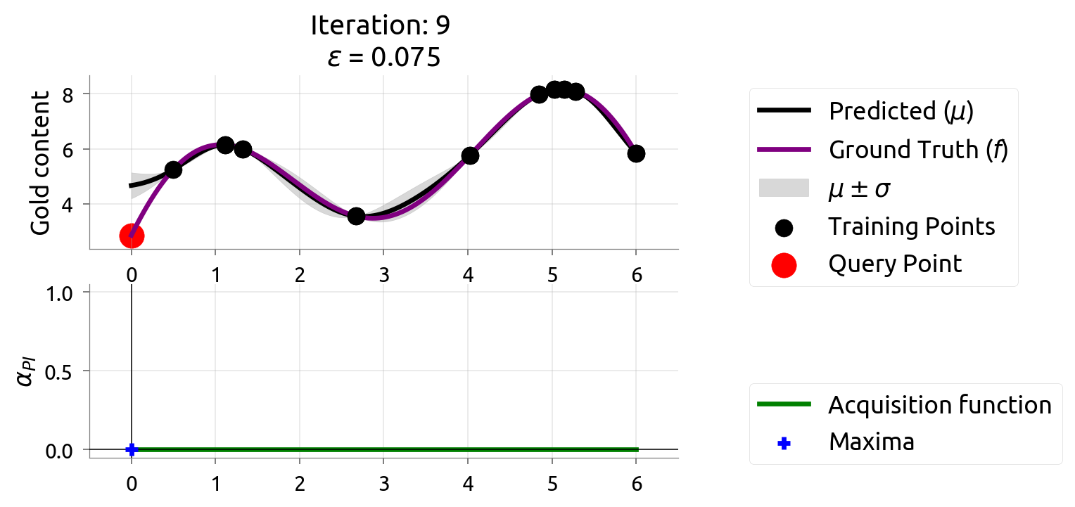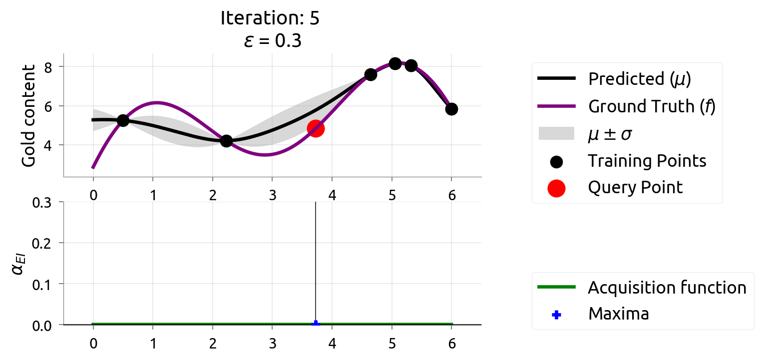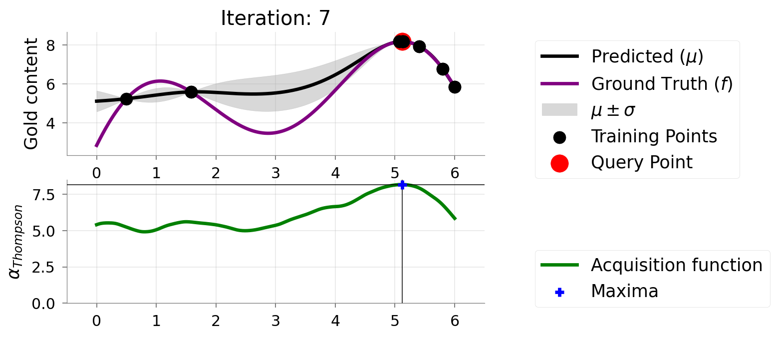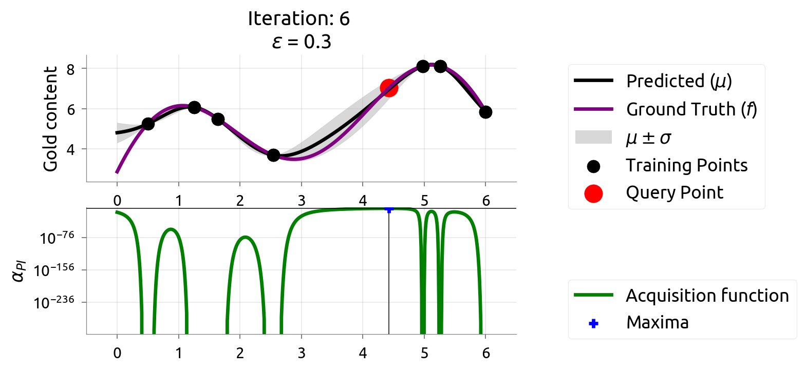 Initially, we have no idea about the gold distribution. We can learn the gold distribution by drilling at different locations. However, this drilling is costly. Thus, we want to minimize the number of drillings required while still finding the location of maximum gold quickly.