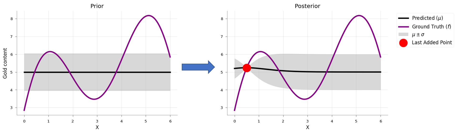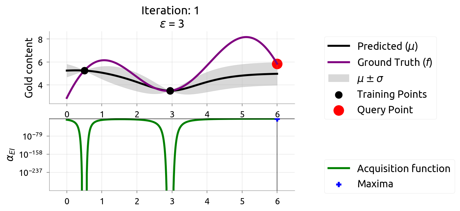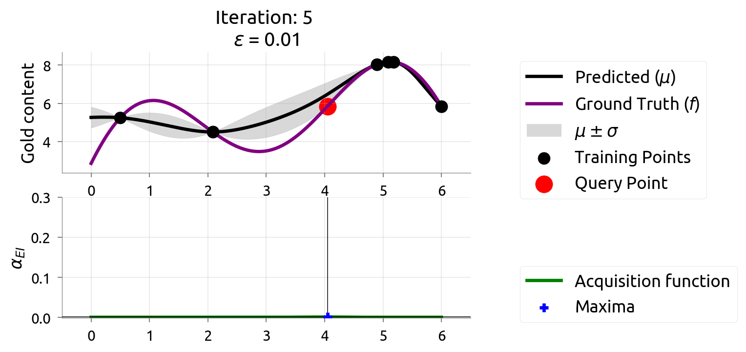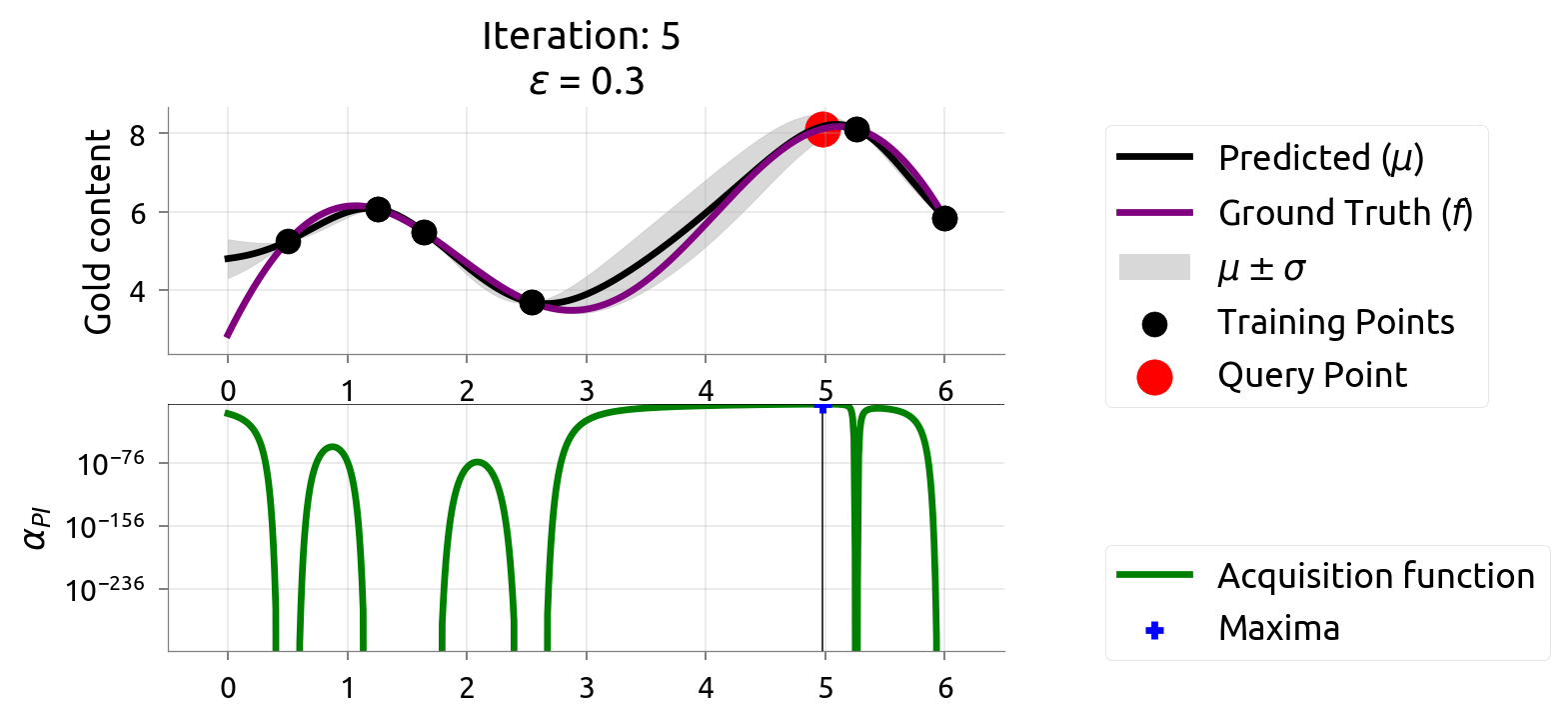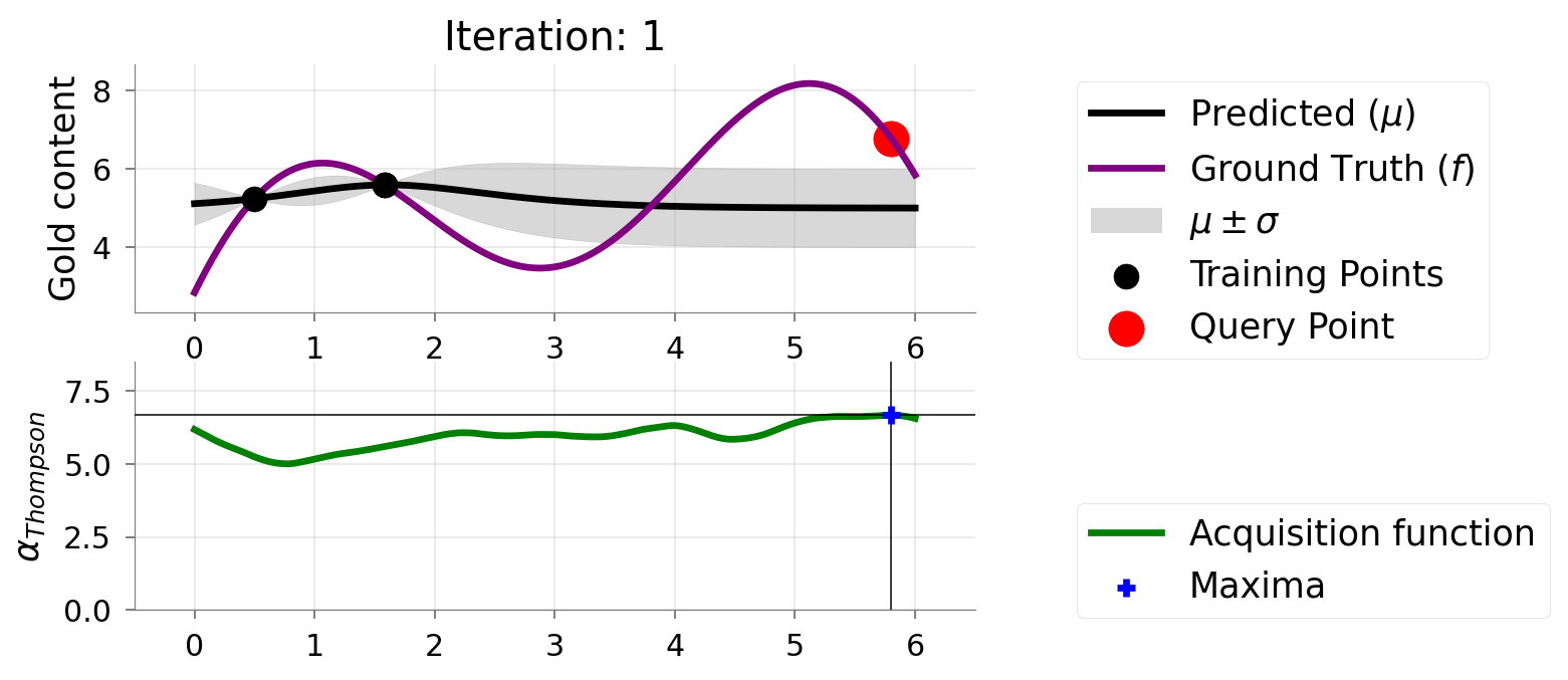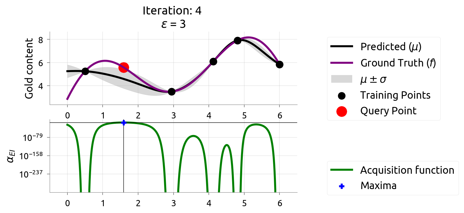 Initially, we have no idea about the gold distribution. We can learn the gold distribution by drilling at different locations. However, this drilling is costly. Thus, we want to minimize the number of drillings required while still finding the location of maximum gold quickly.