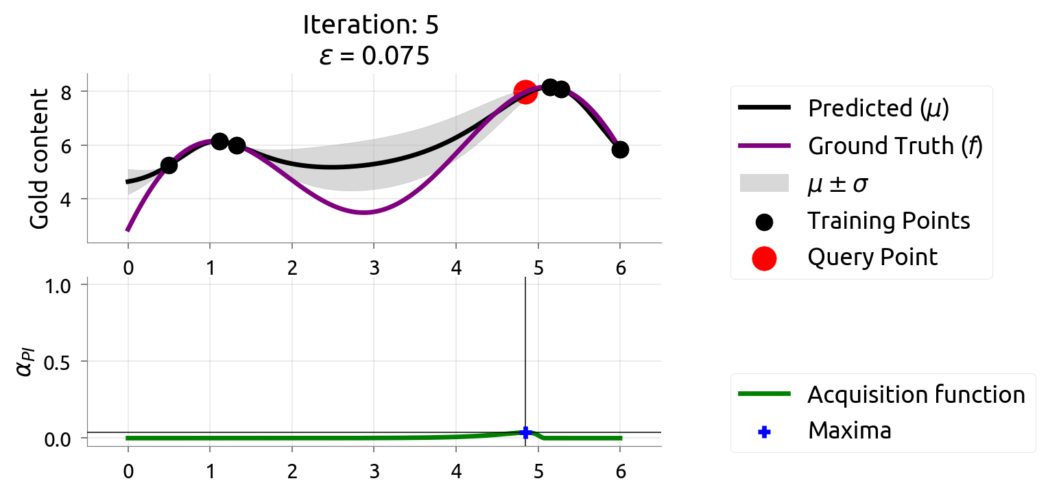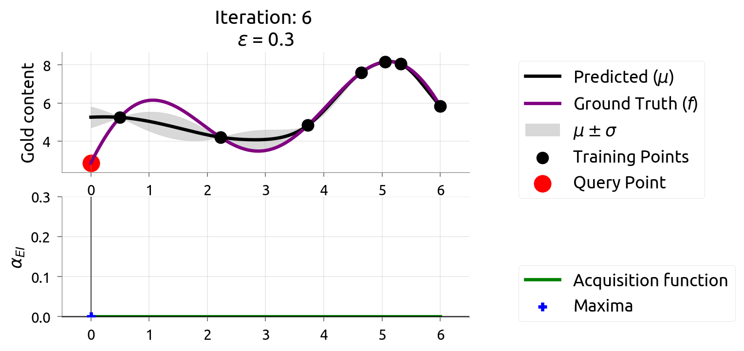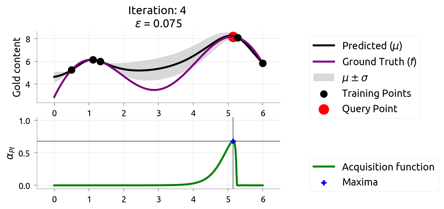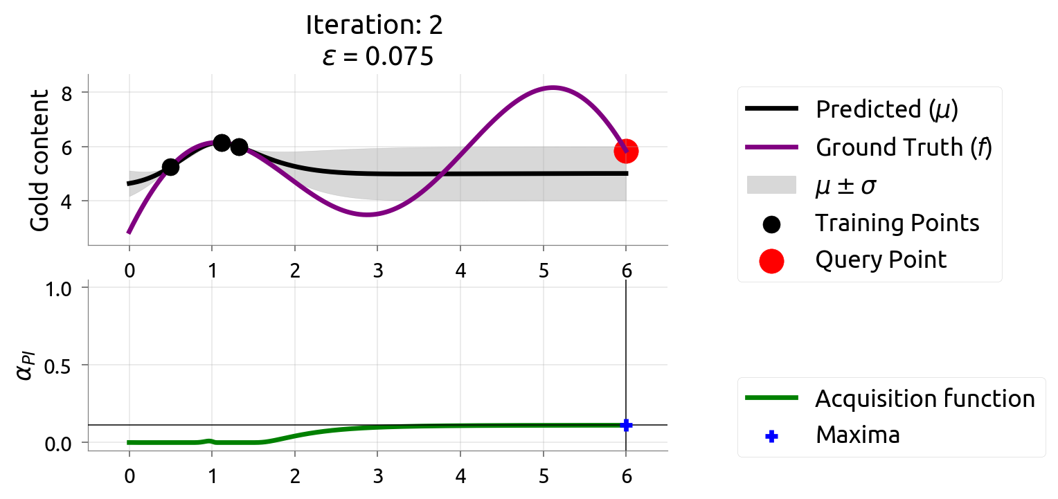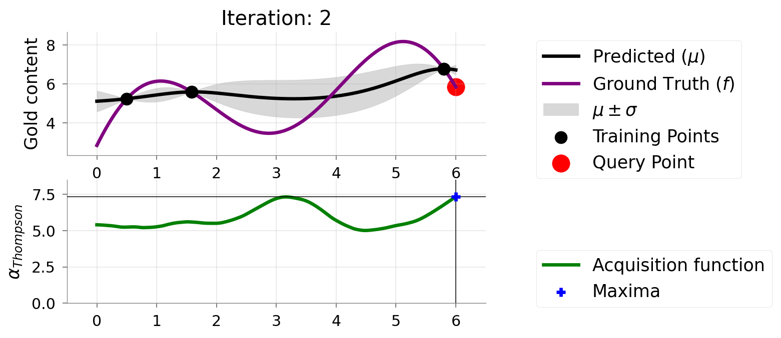 Initially, we have no idea about the gold distribution. We can learn the gold distribution by drilling at different locations. However, this drilling is costly. Thus, we want to minimize the number of drillings required while still finding the location of maximum gold quickly.