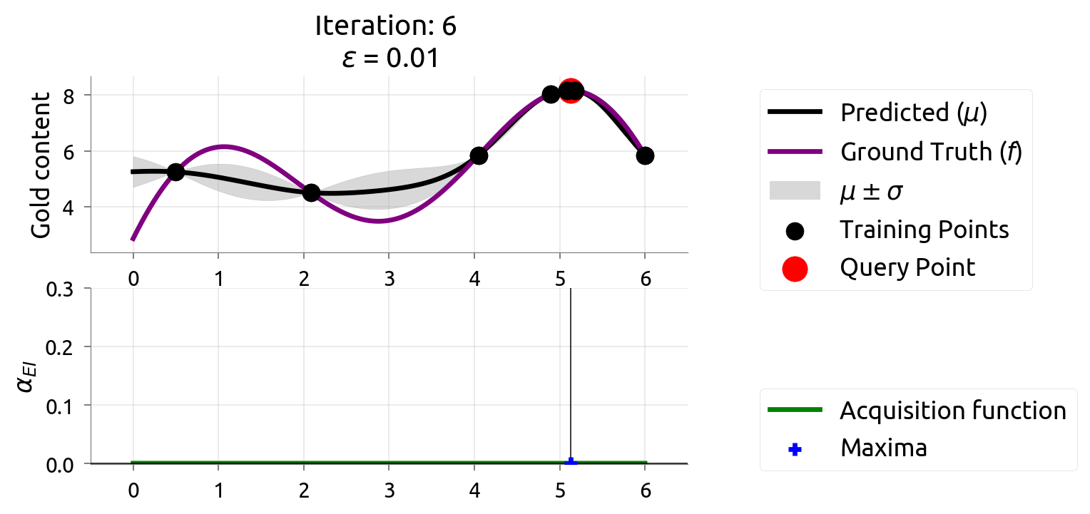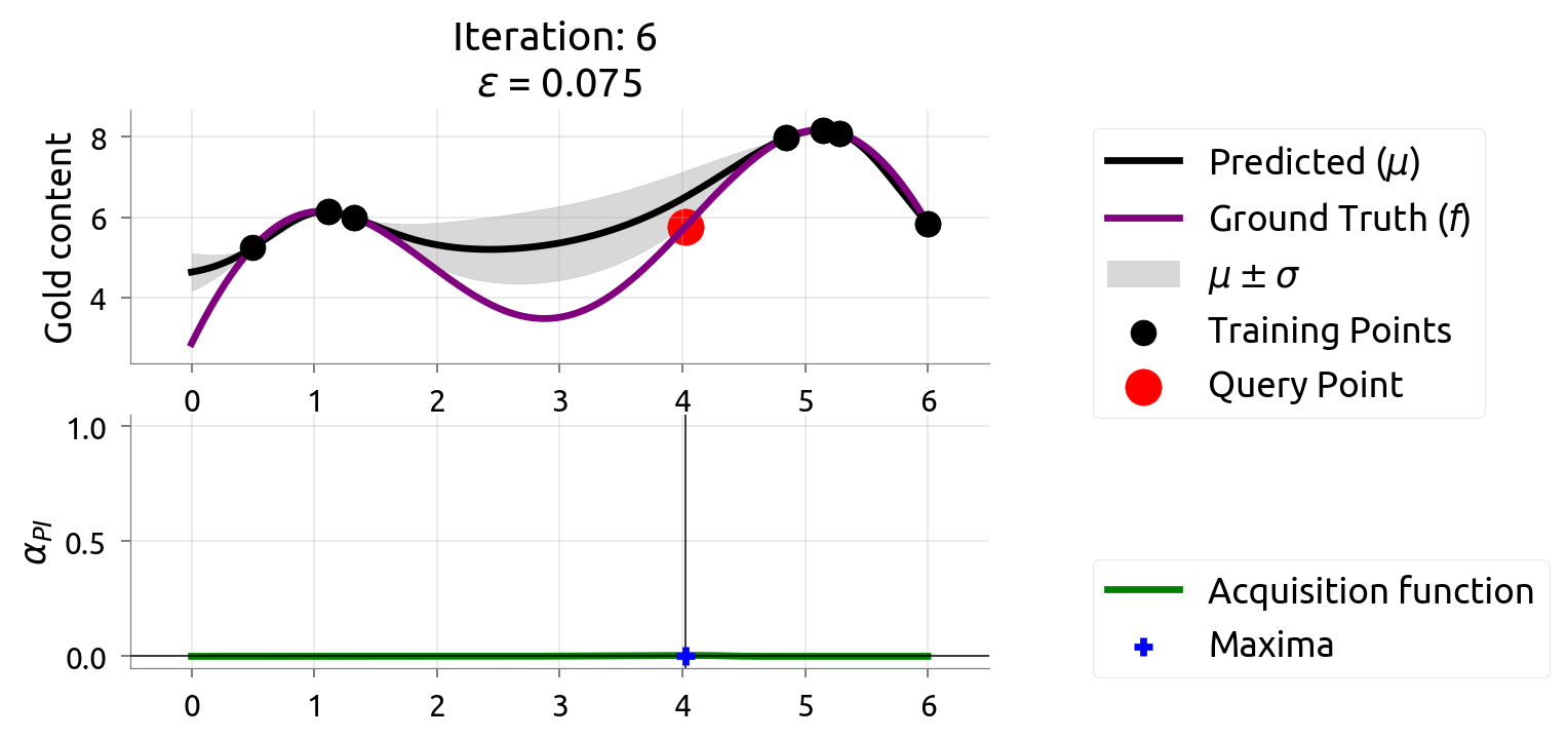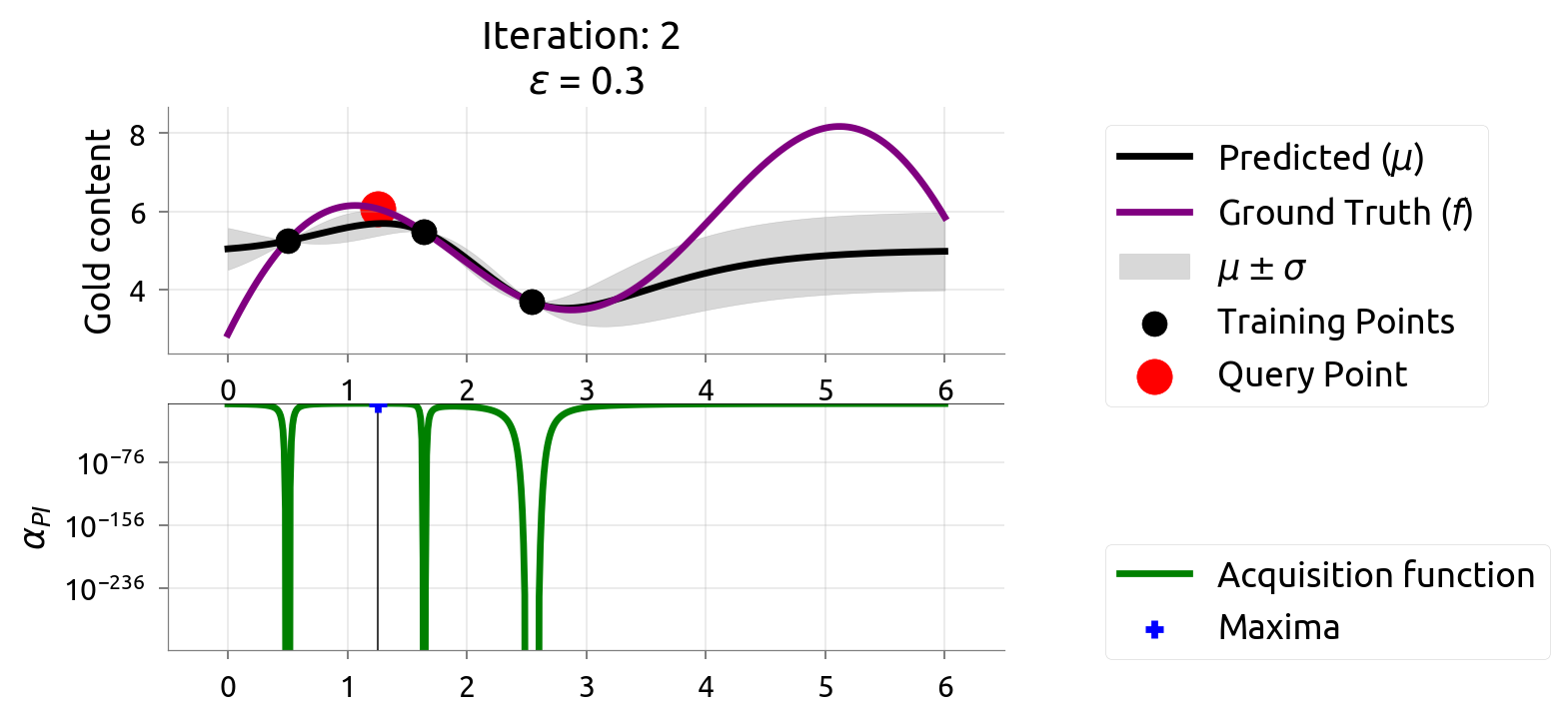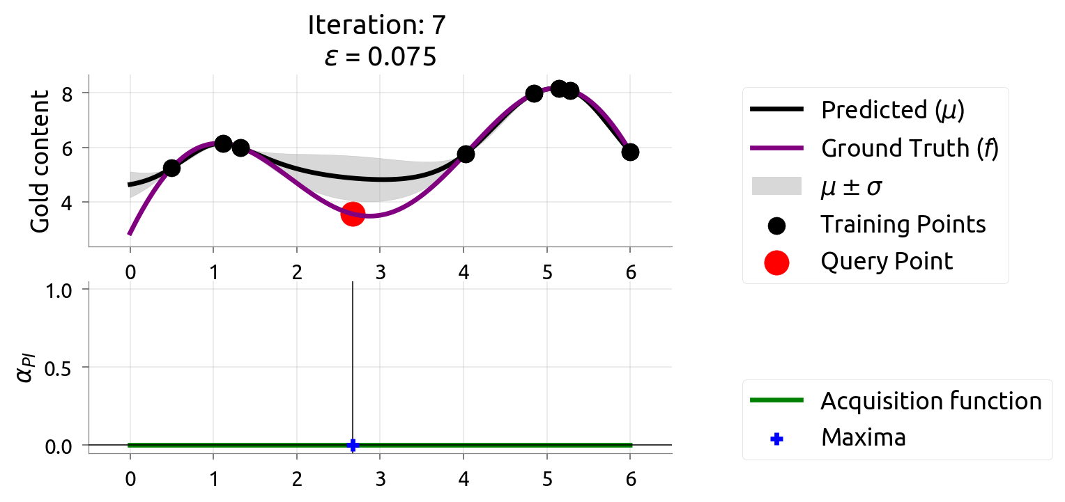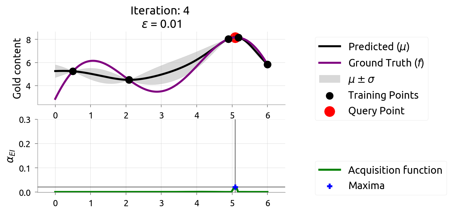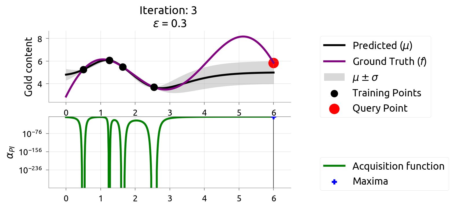 Initially, we have no idea about the gold distribution. We can learn the gold distribution by drilling at different locations. However, this drilling is costly. Thus, we want to minimize the number of drillings required while still finding the location of maximum gold quickly.