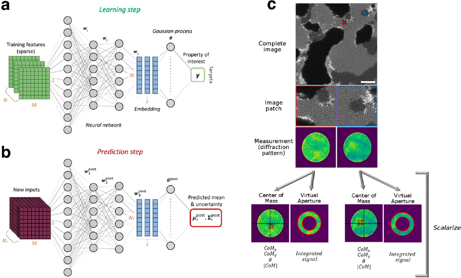 Figure 1: DKL workflow for 4D-STEM: learning (a), prediction (b), and measurement (c). Features are HAADF-STEM image patches; targets are scalarized diffraction patterns from patch centers.