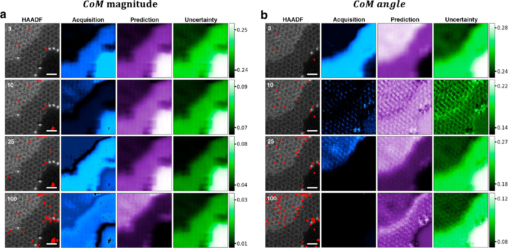 DKL active learning on MnPS3 with DPC CoM scalarizer. Shows exploration pathway, predictions, and uncertainty at key steps. Periodic interference from sulfur vacancy generation. Scale bars: 5 and 2 nm.
