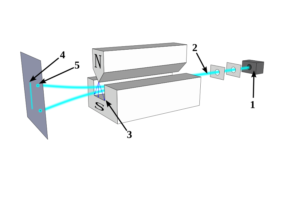 Stern-Gerlach apparatus: 1) oven 2) focusing screens 3) inhomogeneous \(\boldsymbol{B}\) field 4) classical prediction 5) observation. Source: Wikipedia