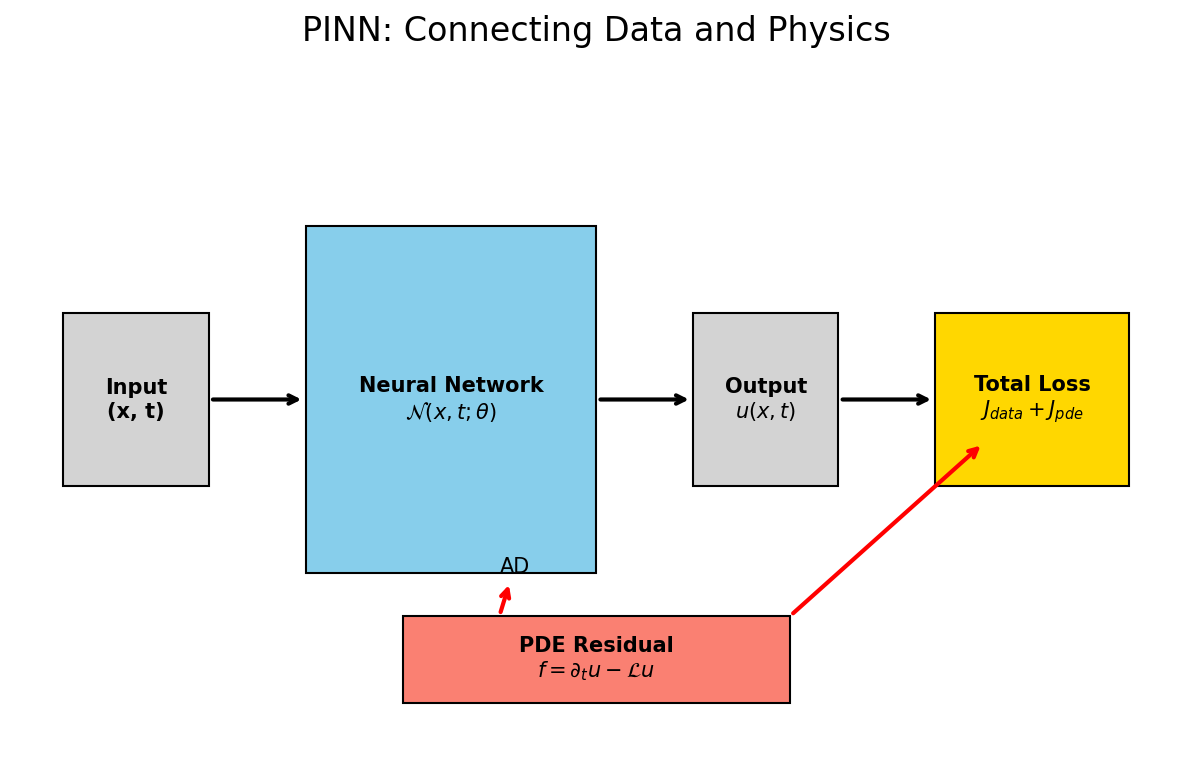 - \(J(\boldsymbol{\theta}) = \lambda_{data} J_{data} + \lambda_{pde} J_{pde} + \lambda_{bc} J_{bc}\)
